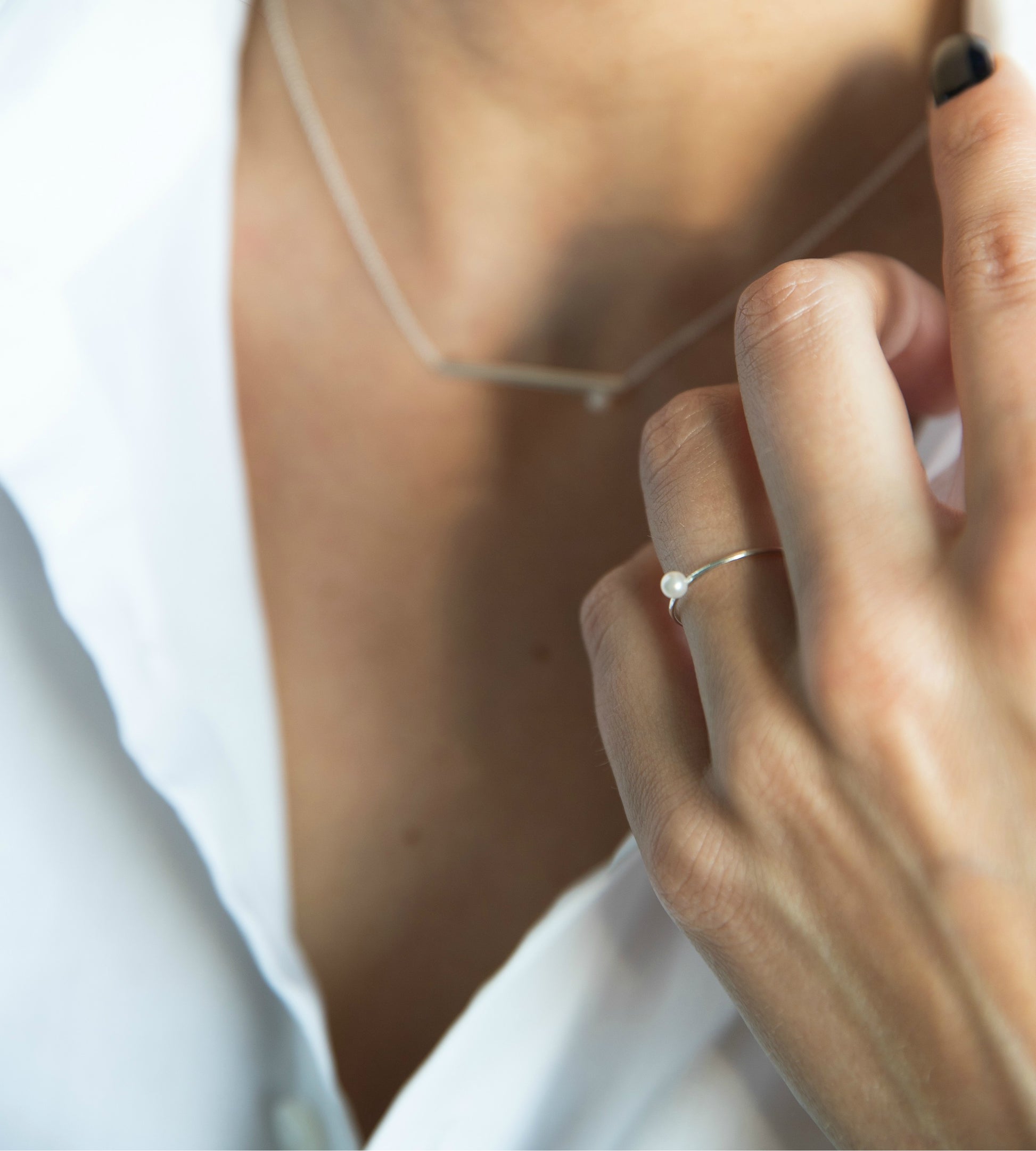 Šioje kolekcijoje juntamas estetinio jautrumo mišinys, kurį papildo aiškios geometrinės ir architektūrinės formos. Minimali grafinė linija ir gėlavandeniai perlai sukuria vientisą, harmoningą visumą.
