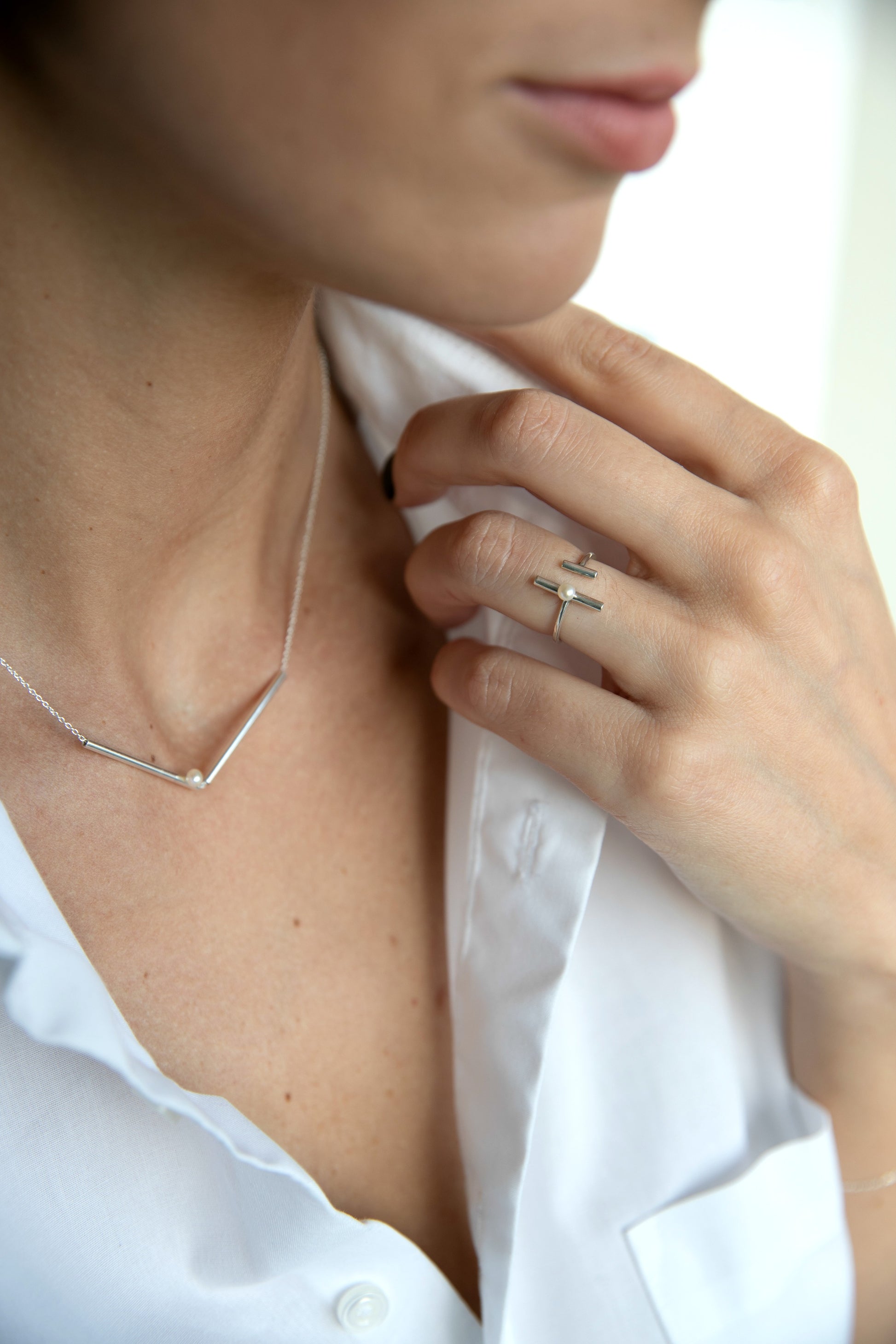 Šioje kolekcijoje juntamas estetinio jautrumo mišinys, kurį papildo aiškios geometrinės ir architektūrinės formos. Minimali grafinė linija ir gėlavandeniai perlai sukuria vientisą, harmoningą visumą.